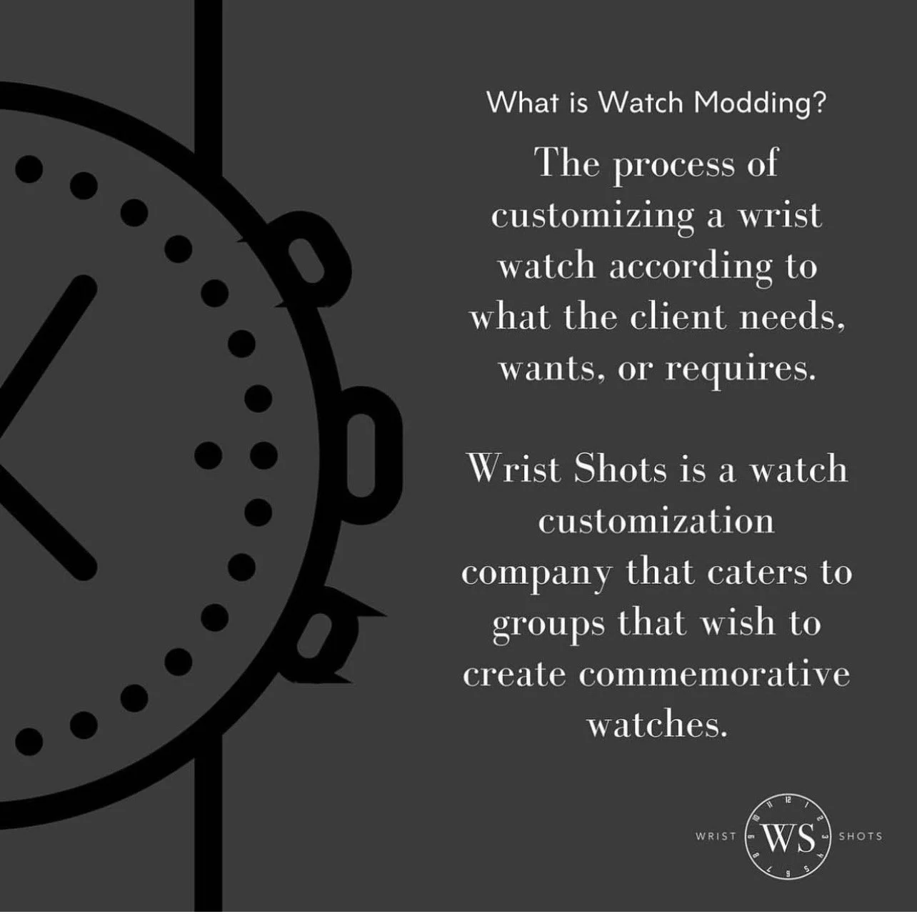 Established in 2020, Wrist Shots is a product of vivid imagination and creativity of a group of watch enthusiasts. Its aim is to make custom-crafted timepieces for you and the rest of your team. Wrist Shots specializes in watch parts and dial customization for groups.